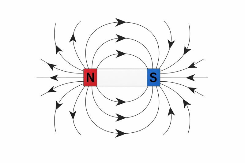 The lines of the magnetic field of a bar magnet lead to the south pole and come from the north pole outside the magnet. While moving in the magnet itself, the field lines are directed from the south pole to the north pole and hence are forming closed and continuous loops. The poles have these lines of force closer together which means that the magnetism is very strong at the poles, as is indicated in the drawing.