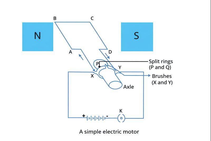 The switch closure enables current to pass through the coil system which includes all ABCD segments. The current flows from A to B in arm AB and from C to D in arm CD. The magnetic field exerts its force from the left side to the right side. According to Fleming’s Left-Hand Rule, a downward force acts on arm AB and an upward force acts on arm CD. The coil begins to rotate in an anticlockwise direction because of the two forces which move in opposite directions.