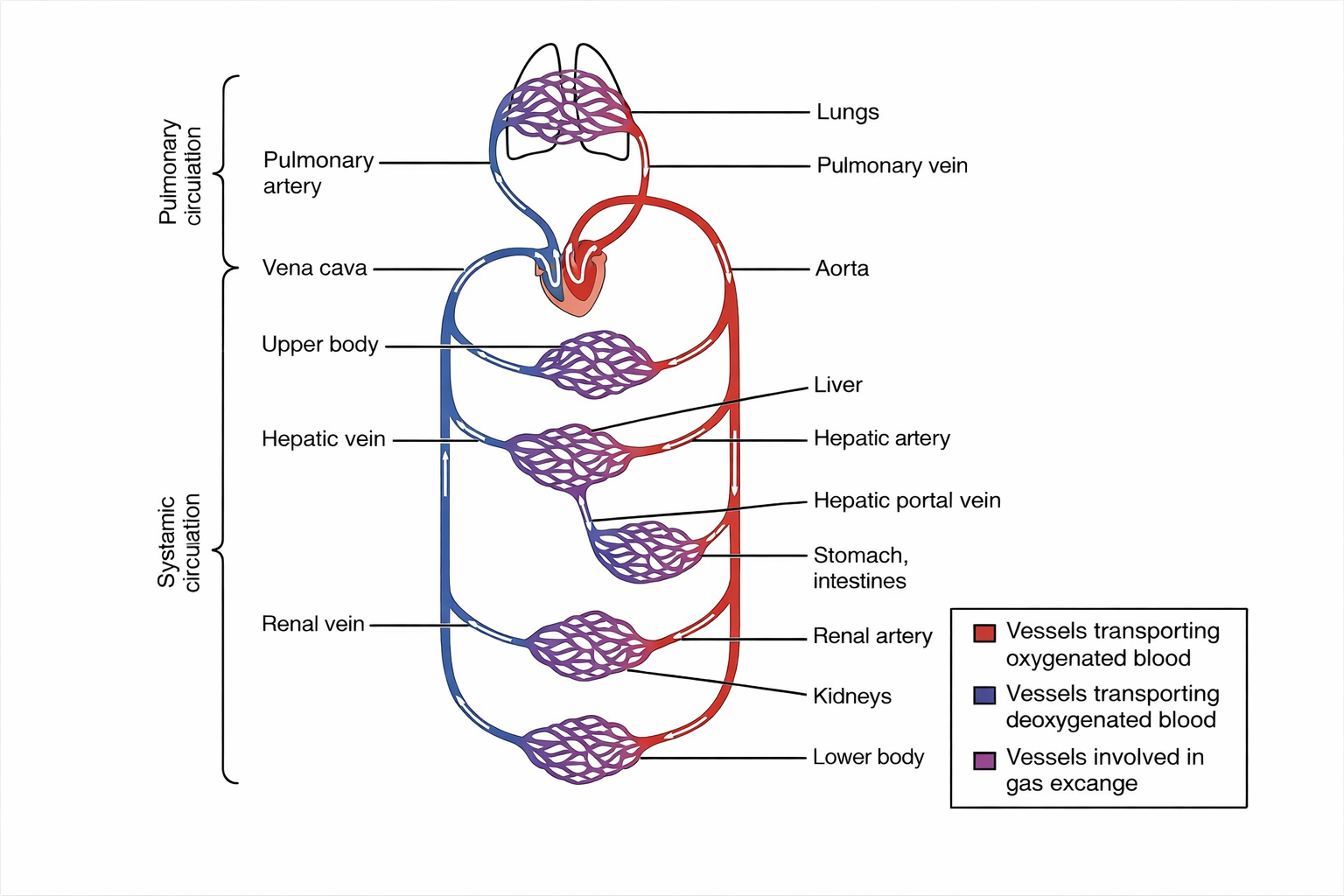2. Systemic circulation: Oxygen-rich blood is pumped by the left ventricle to the body in systemic circulation. After delivering oxygen and nutrients to the body, the deoxygenated blood returns to the right atrium of the heart.